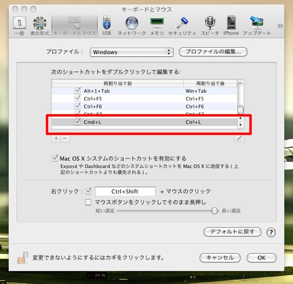 - WindowsXPの設定では画面ロックのキーボードショートカットを殺せないらしいので、環境設定→キーボードとマウスタブ→で仮想マシンのショートカットにCMD+L→CTRL+Lの変換を追加してふせぐのが簡単。
