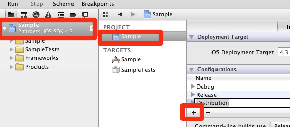 - 左側のNavigatorペインでプロジェクトのルートを選択、真ん中のペインで[PROJECT]→[プロジェクト名]を選択、右側のペインの[Configurators]セクションの左下にある[+]アイコンをクリック、Duplicate Release Configurationを実行し、[Distribution]と名前をつける。(…というのは必要なくReleaseでよくなった?)。