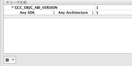 - 左下のギアのアイコンを押し、「ユーザー定義の設定を追加」を実行。GCC_OBJC_ABI_VERSIONを追加。値は1にする。
